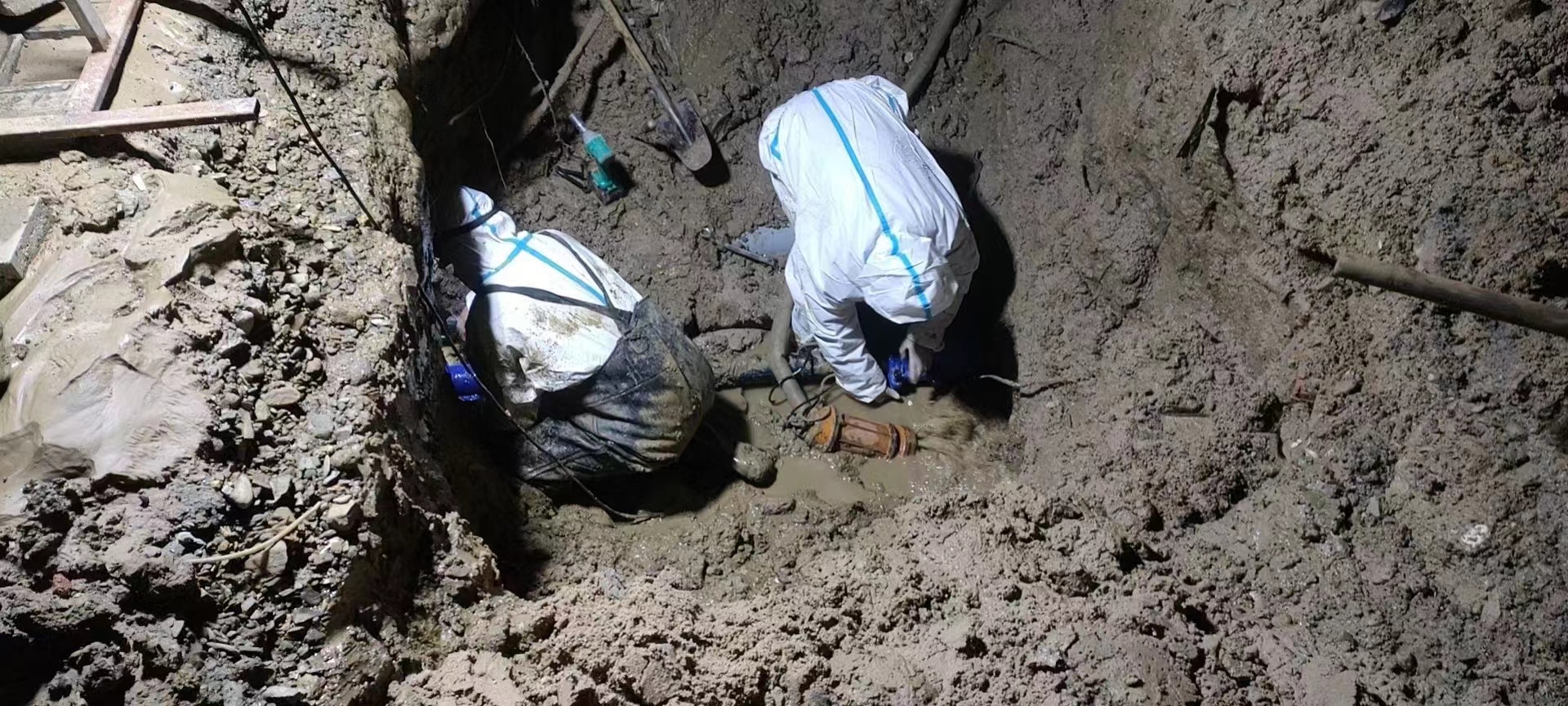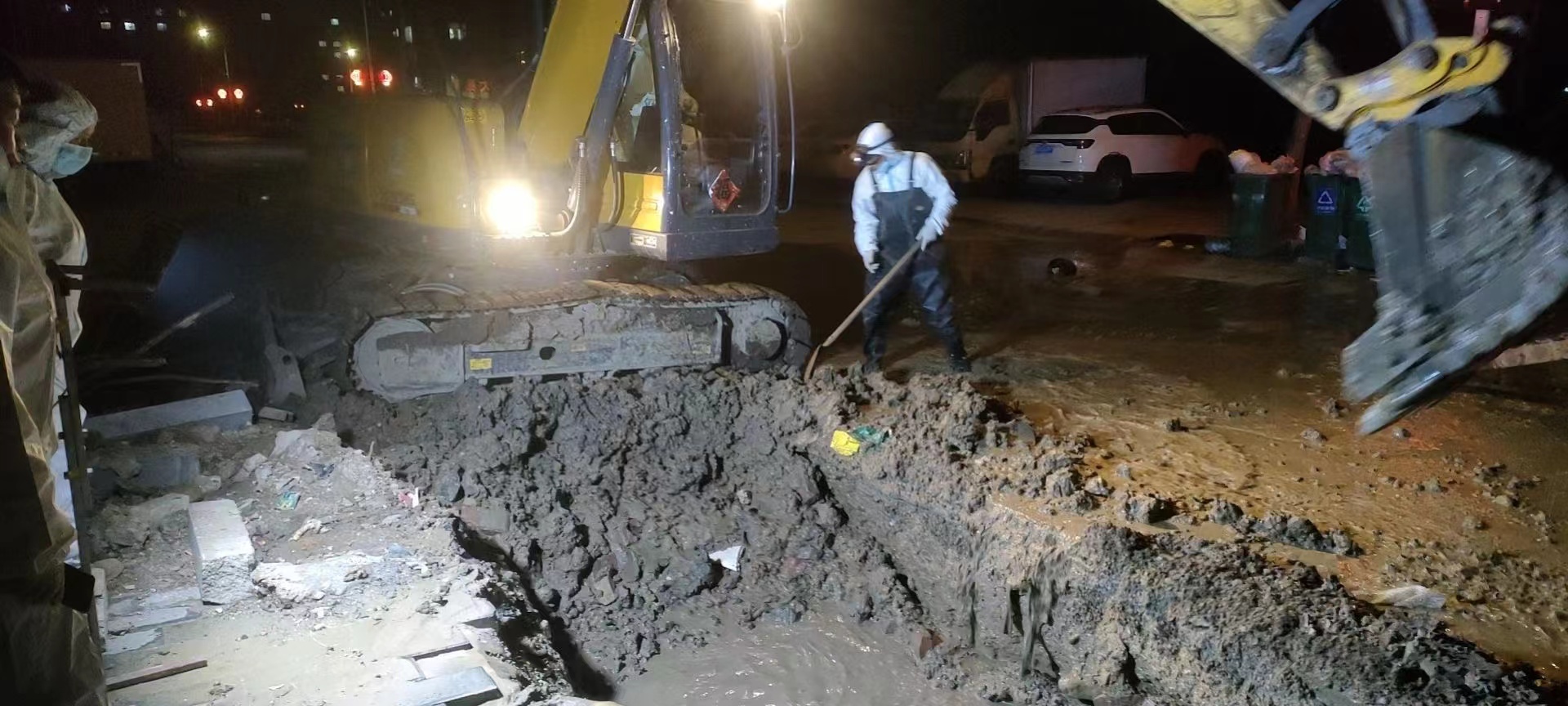 3月15日晚9點多,鲅魚圈分公司接到宋屯小區(qū)物業(yè)的求助電話,小區(qū)內(nèi)主路有大量積水,疑是自來水管道漏水,宋屯小區(qū)全部停水,分公司維修隊全體成員在隊長唐有的帶領(lǐng)下,迅速做好個人防護,對人員和設(shè)備及材料進行消殺后,第一時間奔赴漏水現(xiàn)場。經(jīng)詳實探查發(fā)現(xiàn)是通往宋屯小區(qū)的供水DN900mm主管道管網(wǎng)漏水,現(xiàn)場電、氣、通訊等各條線路縱橫交錯,給搶修工作帶來巨大不便,唐有和隊員們迎難而上,在零下10多度的低溫下輪流上陣,用鐵鍬一點一點掏挖出操作空間。厚重的防護服、護目鏡等防護用具使搶修人員們的動作顯得有些笨拙,憑借著豐富的搶修經(jīng)驗,夜里12時許將漏點挖出,直至凌晨1點半,恢復(fù)了宋屯小區(qū)的正常供水。